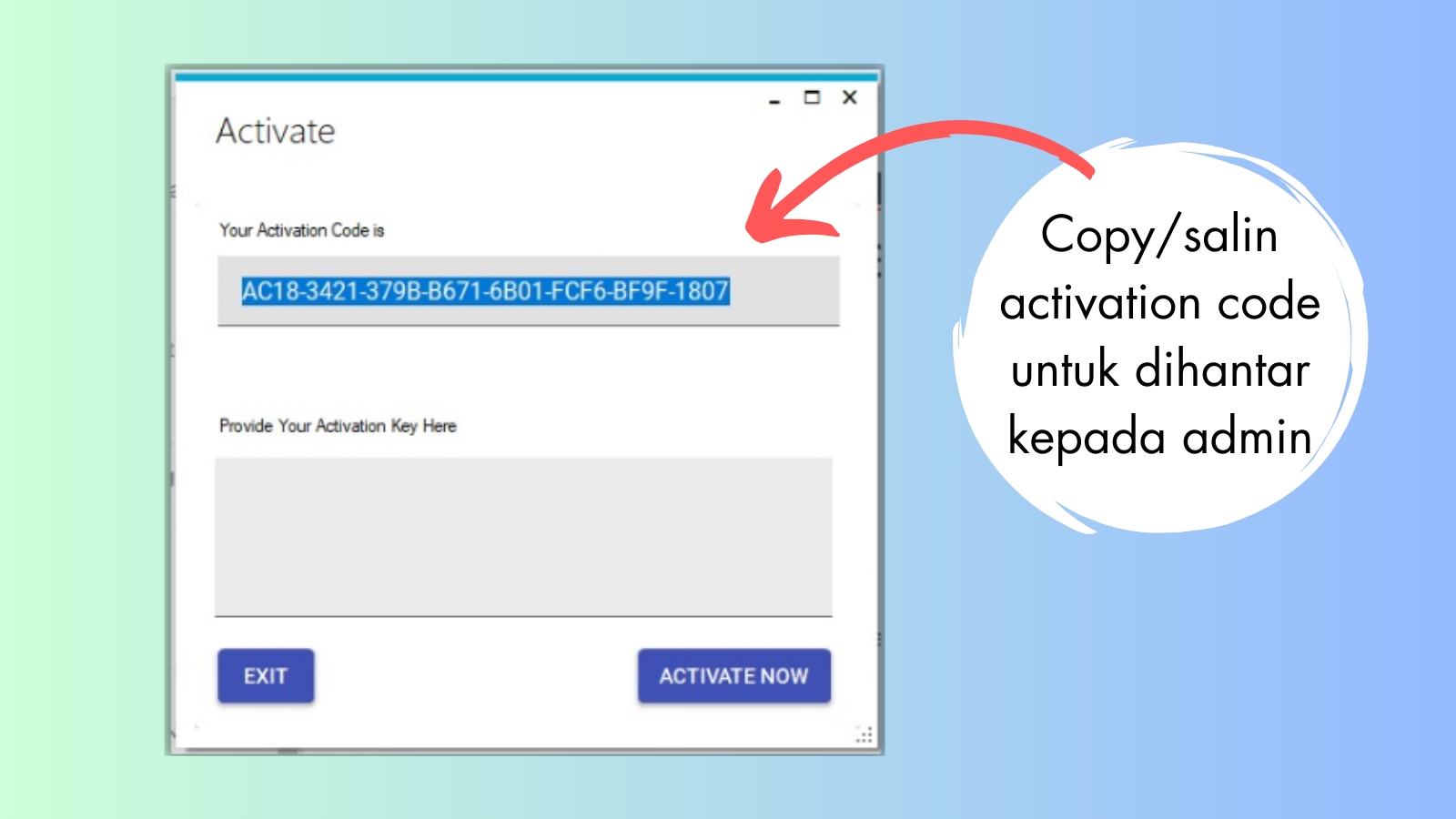 Copy/salin activation code yang dipaparkan pada software. Hantar activation code tersebut kepada admin dengan mengisi borang ini: https://kedai.imzanrazin.com/activate/