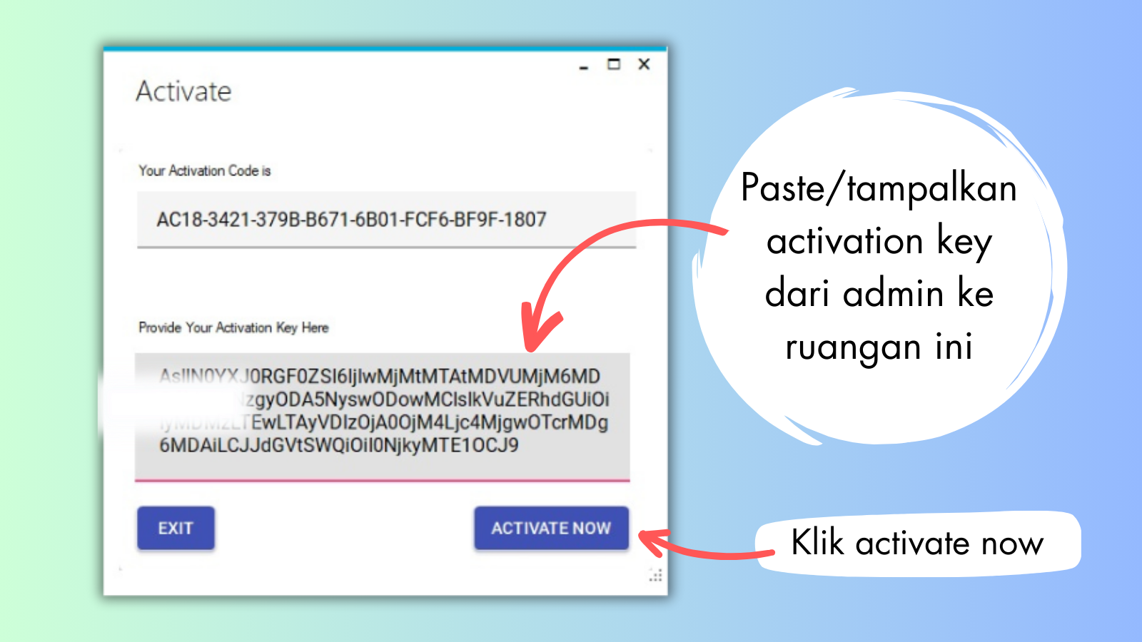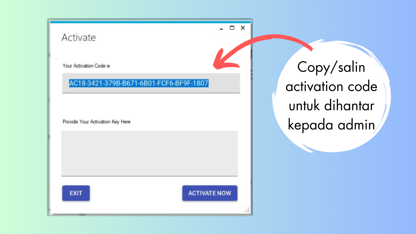 Copy/salin activation key (lesen key) yang dihantar oleh admin dan paste/tampal activation key (lesen key) tersebut pada software (rujuk gambar dibawah).