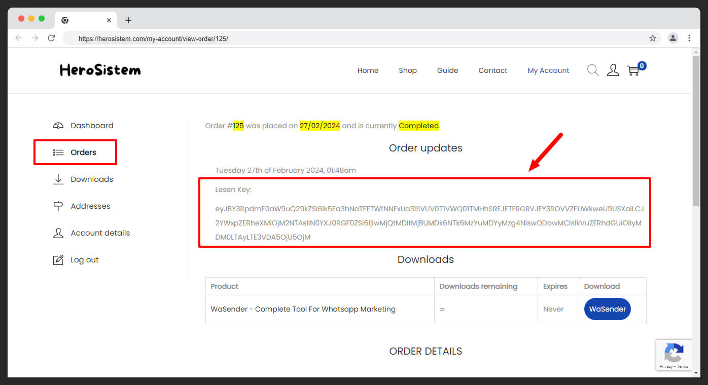 Setelah anda menekan butang **View,** anda dapat lihat maklumat order anda dengan lebih terperinci termasuklah lesen key software yang telah dihantar oleh admin.