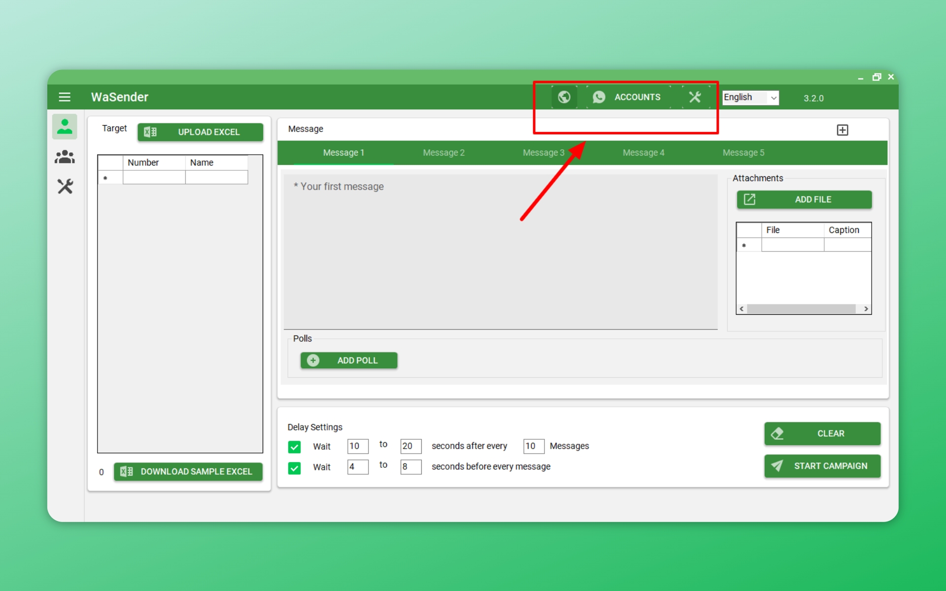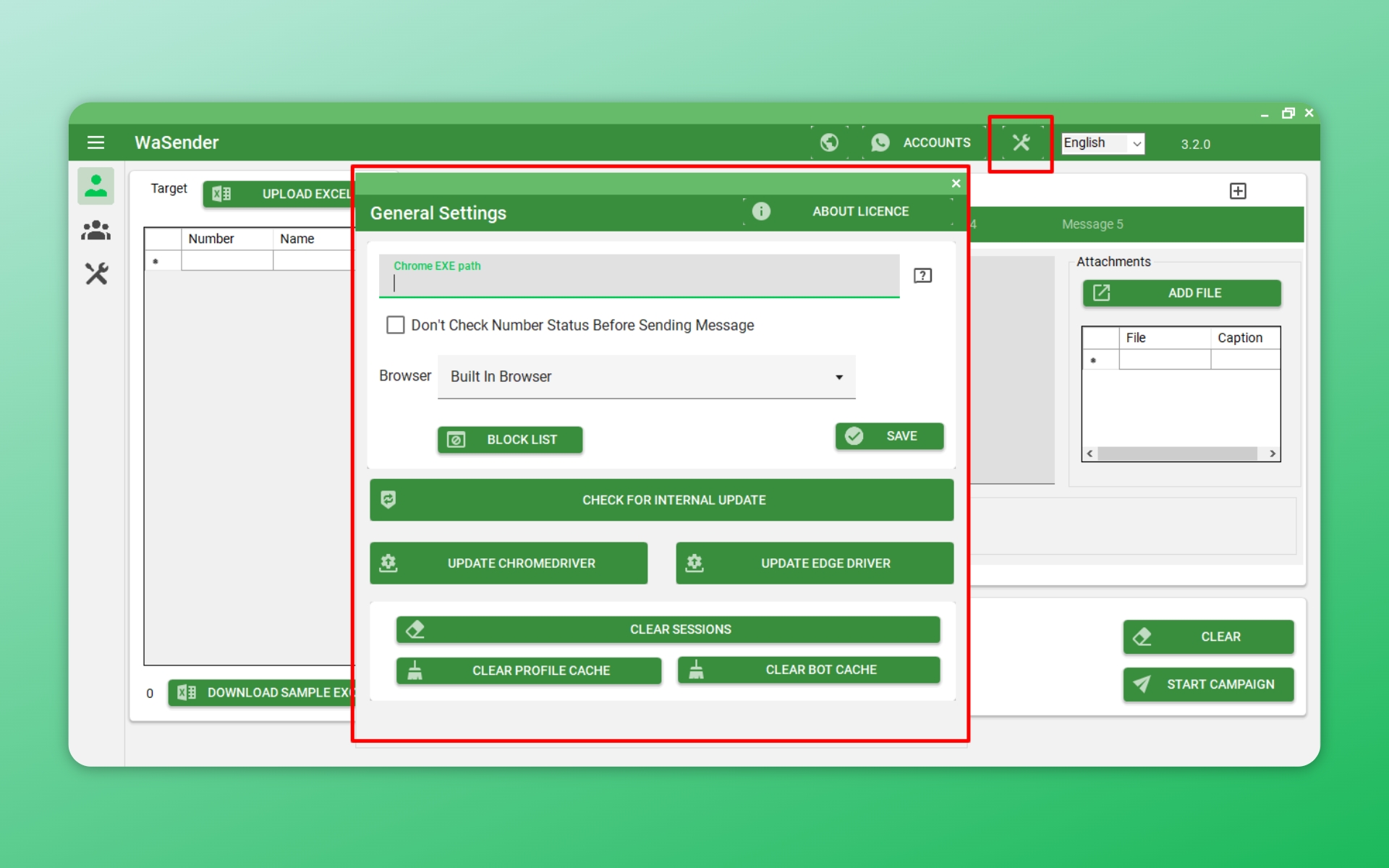 Ini ialah paparan utama untuk software WaSender selepas anda berjaya aktifkan software ini. Bahagian yang bertanda seperti dalam gambar dibawah ialah bahagian settings.
